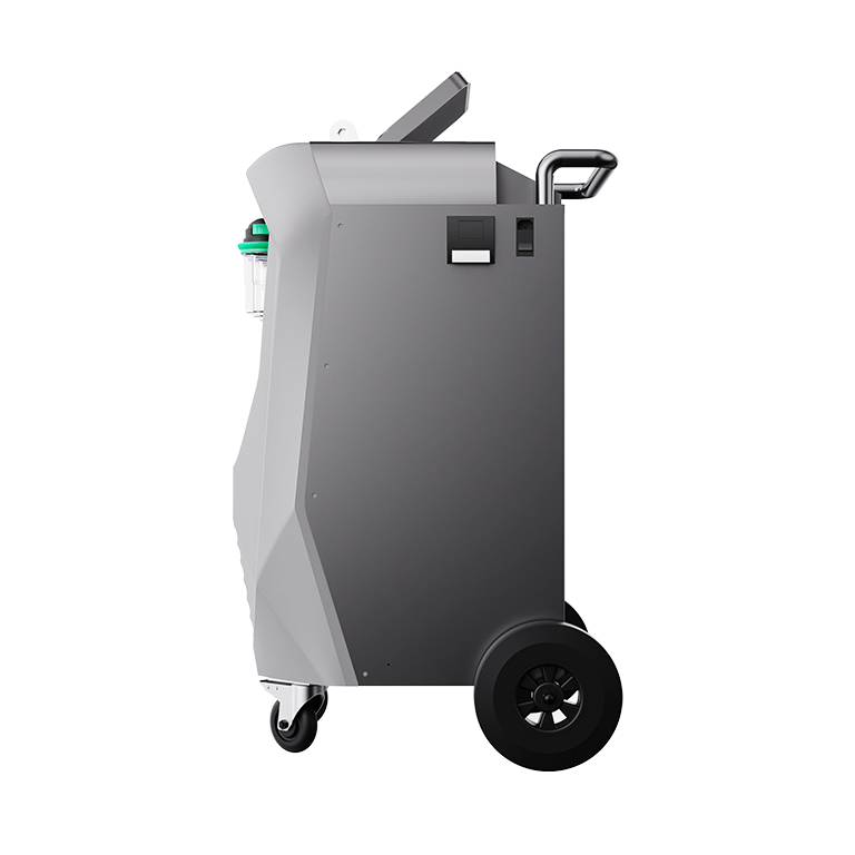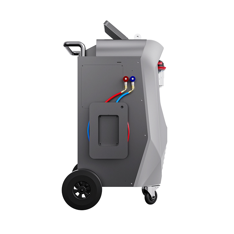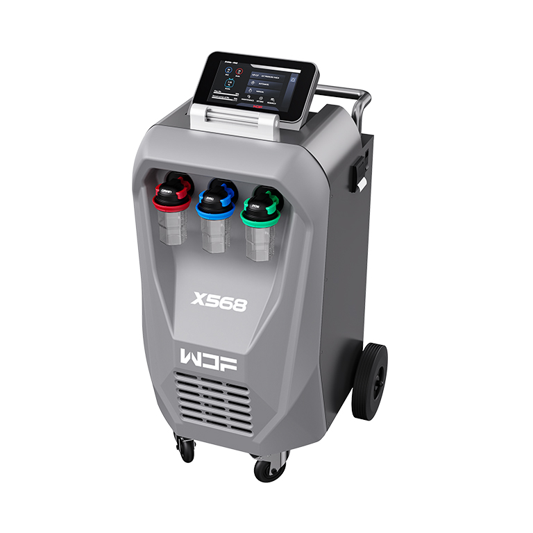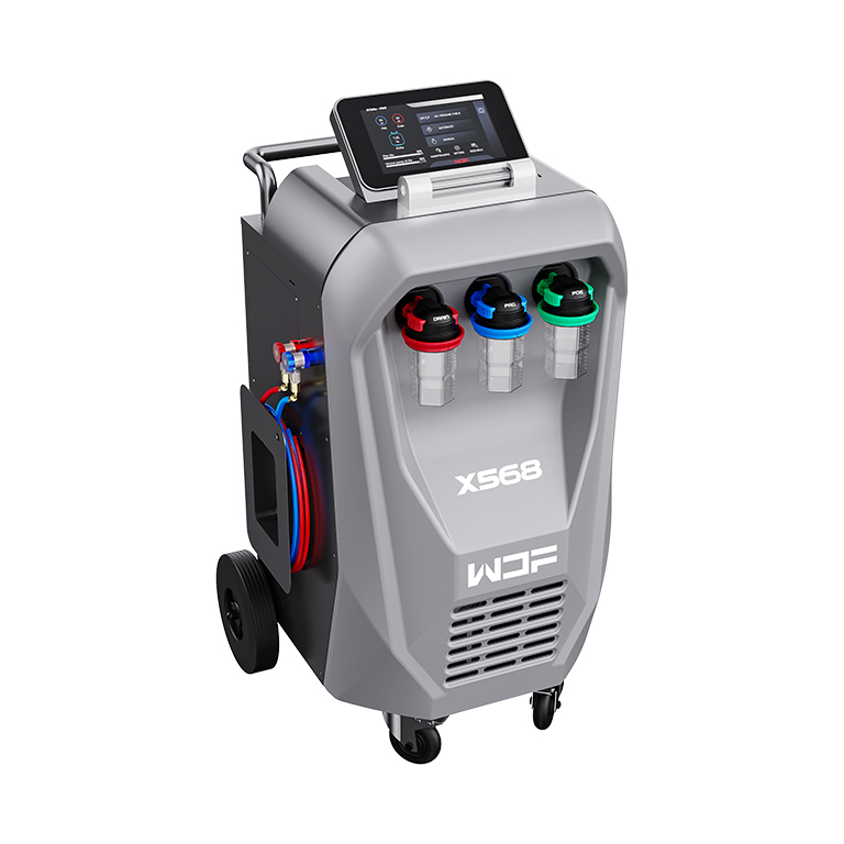 The fully automatic X568 combines all maintenance functions, including recovery, vacuum, charge flushing, and leak testing. Featuring a 10-inch swiveling touchscreen, the X568 displays system pressure, temperature, recovery, and charge amounts on a digital interface. The unit is equipped with a sight glass that allows visibility during the flushing operation, enabling users to observe the flow of refrigerant and assess the cleaning effect before and after the process. Thanks to the innovative design program and oil separator, the oil drainage rate exceeds 80%, ensuring efficient oil exchange. Additionally, two new oil injection bottles with scales for PAG and POE enhance the unit's compatibility for servicing hybrid and electric vehicles.